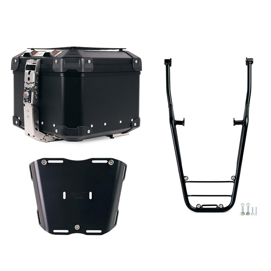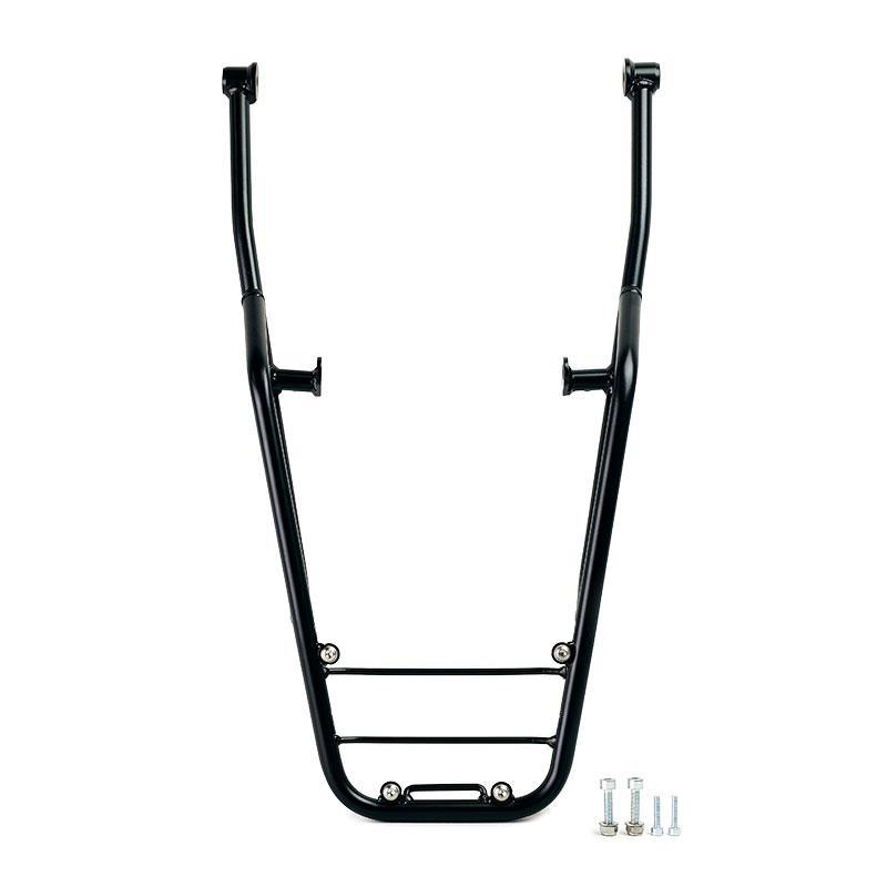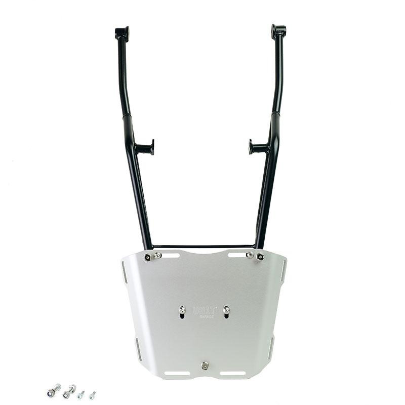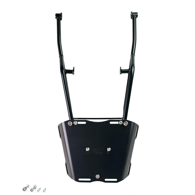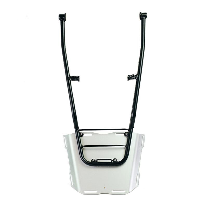マットブラックのエポキシ粉体塗装を施したスチールチューブ製のラゲッジラック。リアエンドにマッチし、パッセンジャー用グラブハンドルを備えています。付属のネジで簡単に純正バイクに取り付けられます。頑丈で実用的で、サポート面にはAL5プレートを取り付けるための取り付けブッシュが4つ付いています。