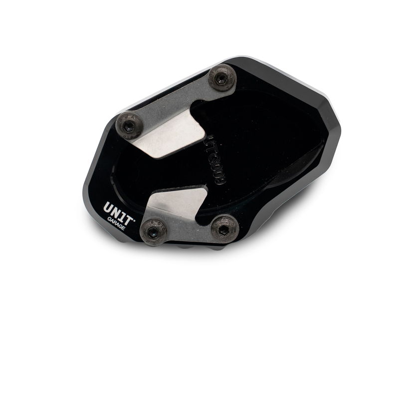 オリジナルのスタンドの支持面はかなり脆弱です。柔らかい路面や高温のアスファルト上でも、このビレットエルガルプレートは安定したスタンドを提供します。防錆ブラックアルマイト仕上げで、刻印とロゴ入り。わずか数分で取り付け可能です。