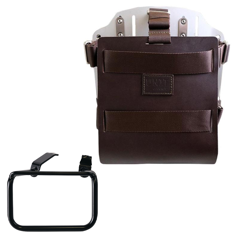 調整可能なレザーフロントを備えた陽極酸化アルミニウムのバッグホルダープレート。 クイックリリースシステムコードU000がすでに含まれ、フレーム自体をロックするためのロックが装備されているプレートの背面に取り付けられているため、バッグホルダーフレームにすばやく取り付けられます。プレートは、バイクの側面に平らな取り付け面を作成します。これにより、接続されていないバッグや、寝袋、ジャケットなどの他の物体を輸送できます。フロントフラップは、3 mmの革仕上げの細部に注意を払い、付属のスライダーを使用して調整でき、プレートから非常にすばやく取り外すことができます。