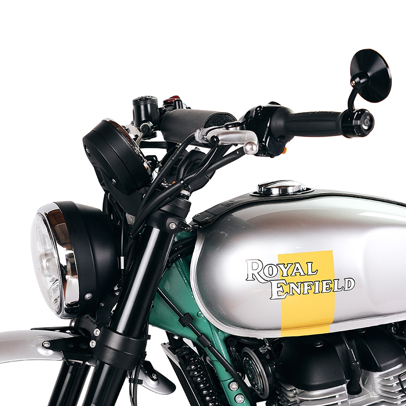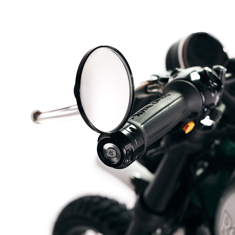 ロイヤルエンフィールド用に特注された黒色アルマイト加工アルミミラー。