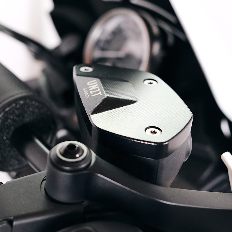 ソリッド CNC から機械加工された一対のブレーキおよびクラッチ オイル リザーバー キャップ。これらは変更を加えずに取り付けられ、元のものと交換され、より保護的でエレガントになります。