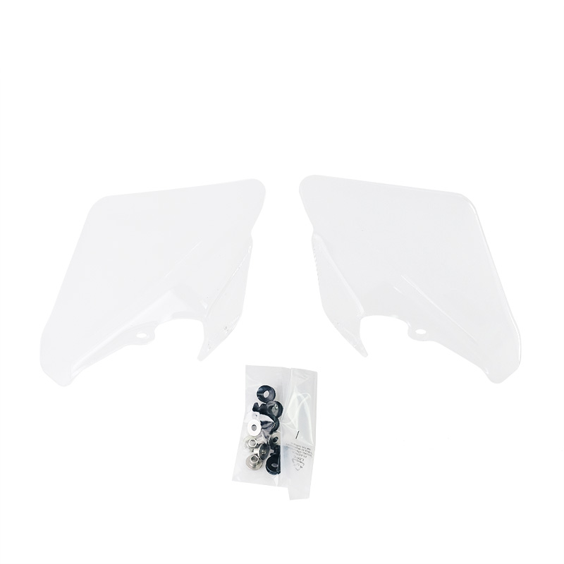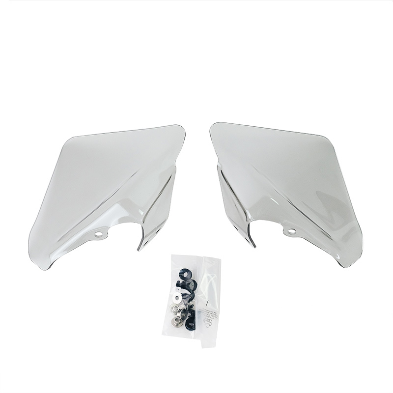 サイドデフレクターのペア、大型モデル(オリジナルより大きい)。改造なしですぐに取り付けられ、必要なものはすべて組み立てキットに含まれています。これらはバイクのデザインを変えるものではありませんが、非常に効果的で、優れた追加の保護を提供します。