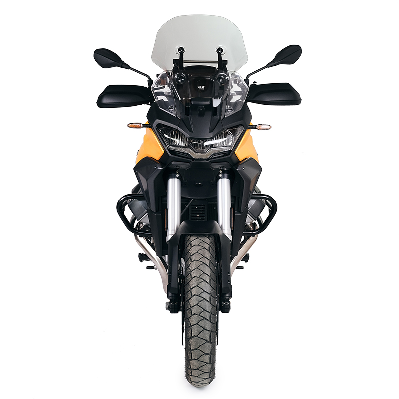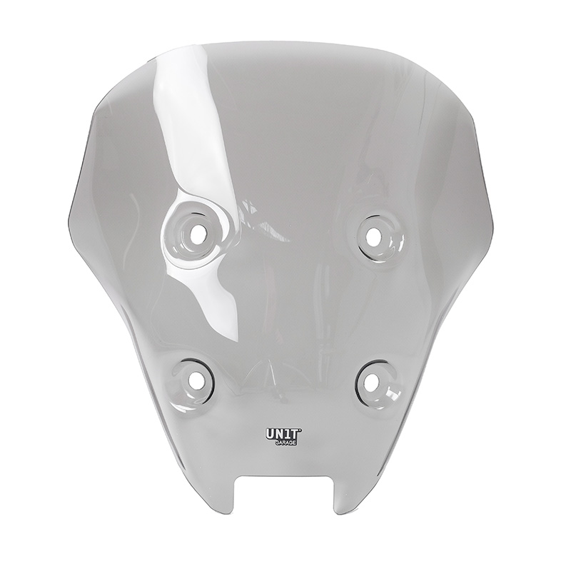 寸法:ツーリングウインドシールドはオリジナルと同じ高さですが、右が2cm、左が2cm広くなっています。厚さは3mm。デフレクターが一体化したウインドシールドです。