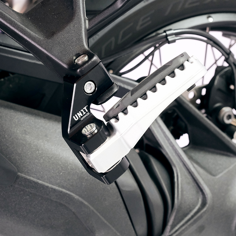 CNC アルミニウム合金製、陽極酸化仕上げのフットレスト サポートのペア。純正のフットレストを下に約50mm、横に約30mm移動させ、サイドバッグを装着した場合にも優れています。