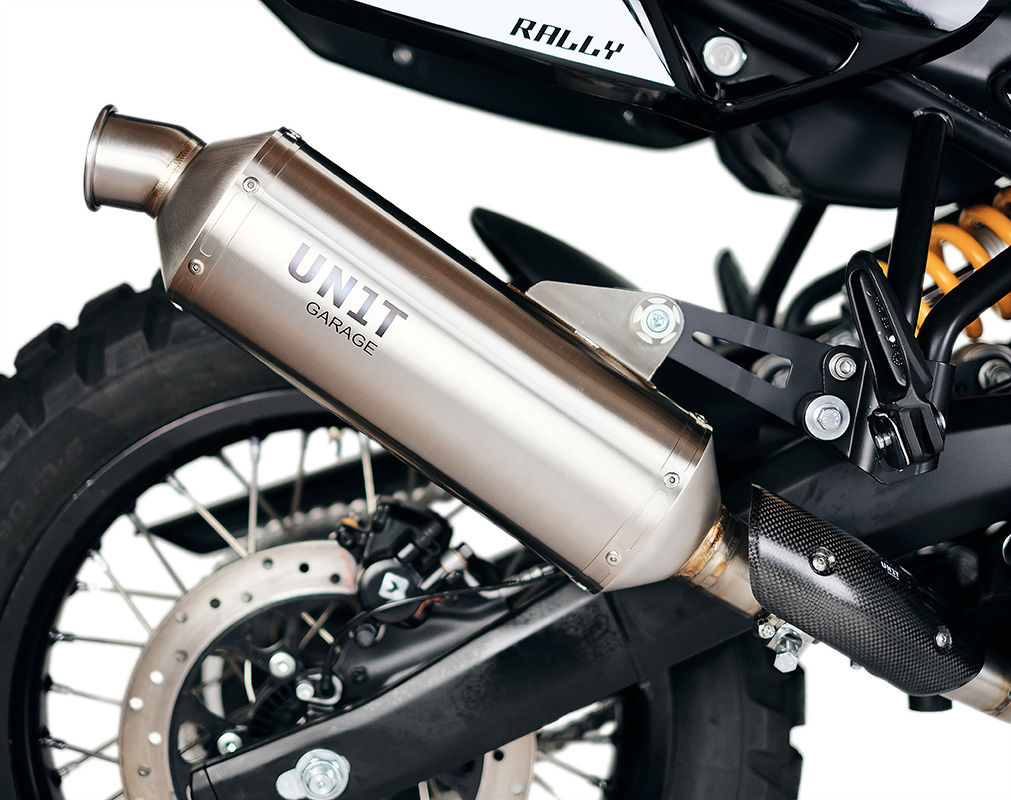 カーボンヒートシールド、ステンレススチールボディ、溶接部分が見えるフィッティングなど、完璧なラリーレイドスタイル。