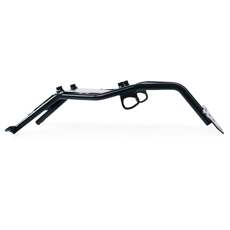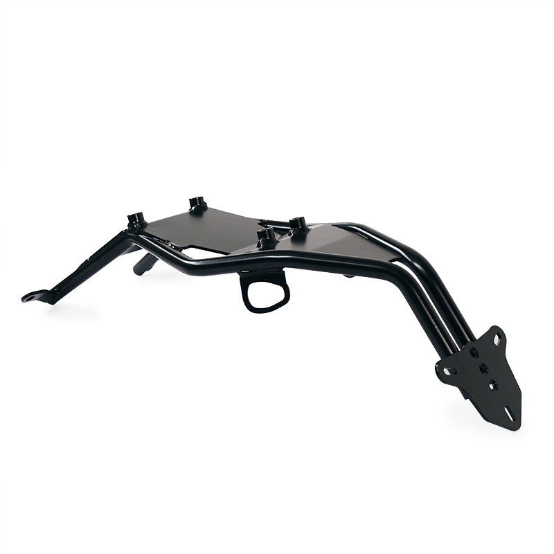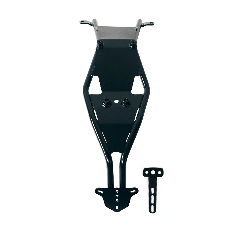 後部のプラスチックが気になりましたが、結果は素晴らしく、取り付けるとバイクの他の部分と一体化します。黒色のエポキシ粉体塗装スチールチューブ製で、オリジナルのナンバープレートライトを収納できるブラケットが付属しています。フレームに非常に簡単に固定され、ナンバープレートとヘッドライトを短くしたり上げたりすることで、バイクの後ろのキャラクターとスタイルを大幅に変えることができます。オリジナルインジケーターのサポート(インジケーターは付属していません)と組み立てに必要なものがすべて揃っており、当社のバッグおよび荷物ラックフレームとオリジナルのフレームの両方と互換性があります。
