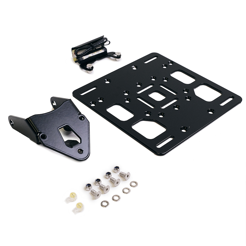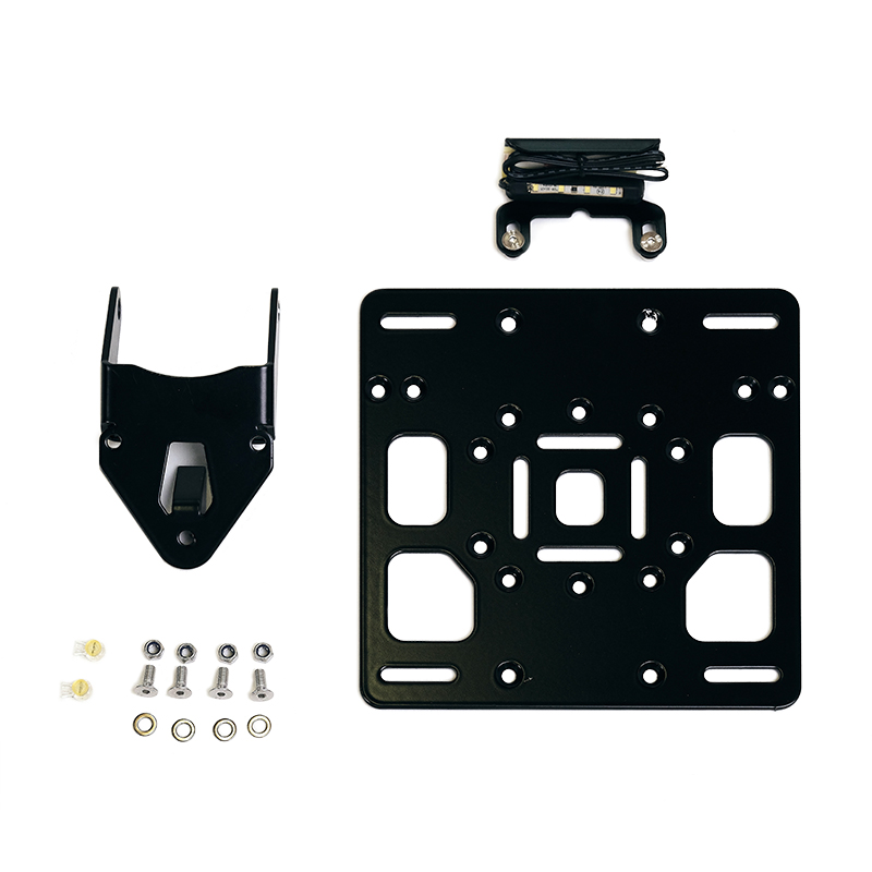 リアのプラスチック部分が気になっていたのですが、結果は素晴らしい!ブラックエポキシ粉体塗装スチール製で、ナンバープレートライトとブラケットが付属しています。ヘッドライトに簡単に取り付けられ、ナンバープレートを短くしたり高くしたりすることで、バイク後部の個性とスタイルを大きく変えることができます。取り付けに必要なものがすべて揃っており、純正品だけでなく、当社のパニアラックとラゲッジラックにも互換性があります。
