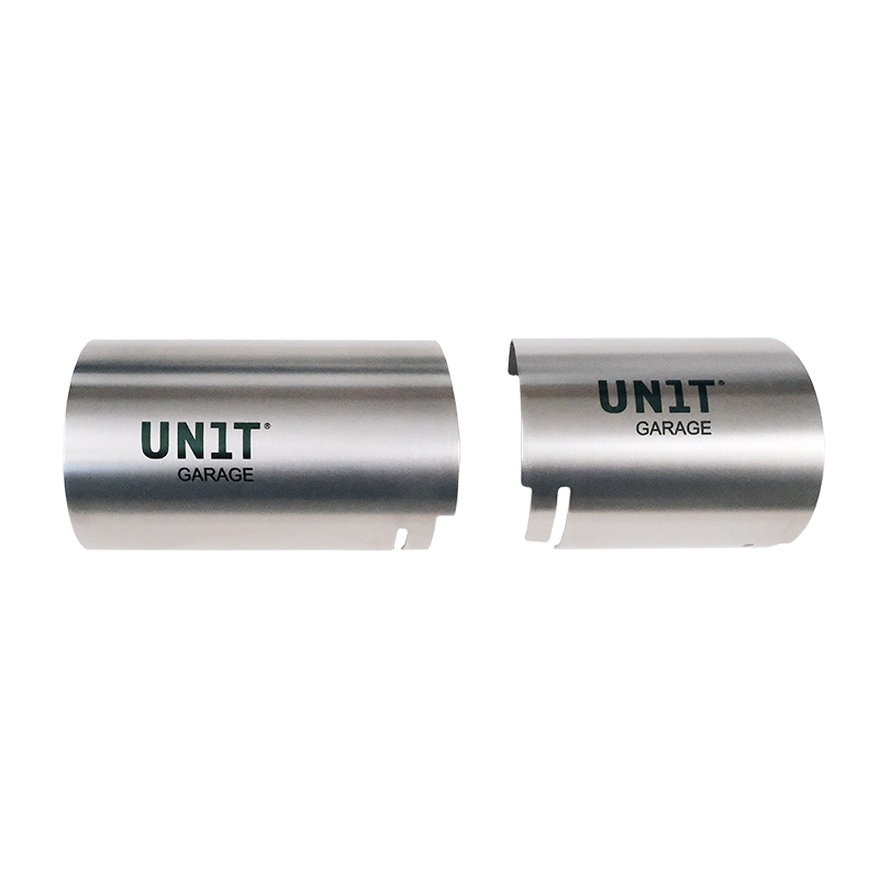 サテンステンレススチール製インテークマニホールドカバー、左右一対、ユニットガレージロゴ入り。